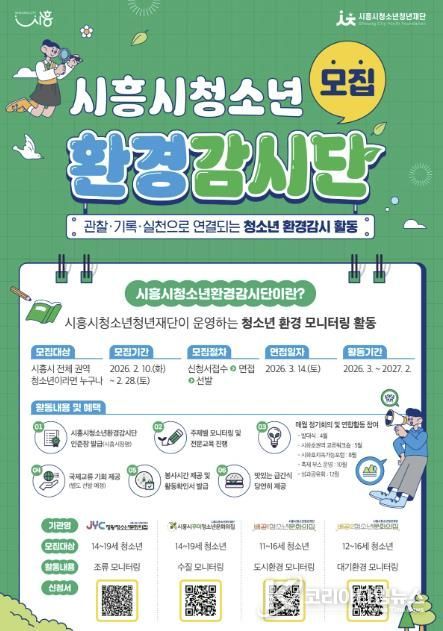 코리아타임뉴스 경기취재본부 | 시흥시청소년청년재단은 청소년이 지역 환경문제를 직접 관찰하고 기록하며, 이를 실천으로 연결하는 ‘제3기 시흥시청소년환경감시단’을 오는 2월 28일까지 모집한다.