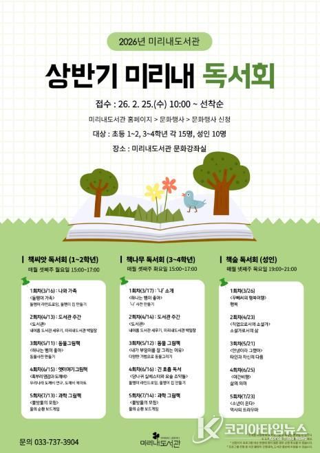 코리아타임뉴스 이아름 기자 | 원주시 미리내도서관은 독서 공동체를 활성화하고 지역사회에 독서문화를 정착시키기 위해, 오는 3월부터 7월까지 ‘2026년 상반기 미리내 독서회’를 운영한다.