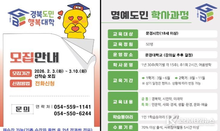 코리아타임뉴스 노승선 기자 | 문경시는 시민들에게 체계적이고 수준 높은 평생학습 기회를 제공하기 위해 2026년『경북도민행복대학 문경시캠퍼스』명예학사과정 입학생을 2월 3일부터 3월 10일까지 선착순 모집한다.