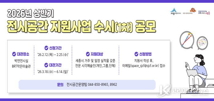 코리아타임뉴스 세종취재분부 | 세종시문화관광재단은 2월 12일부터 2월 25일까지 지역 시각예술인의 창작활동을 지원하고 시민들에게 다양한 전시를 선보이기 위한 ‘2026년 상반기 전시공간 지원사업 수시(1차)’ 공모를 진행한다.
