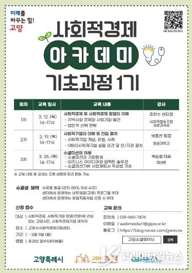 코리아타임뉴스 기동취재팀 | 고양산업진흥원 고양시사회적경제지원센터가 오는 3월 9일까지 ‘2026년 고양시 사회적경제 아카데미 기초과정 1기’수강생을 모집한다.