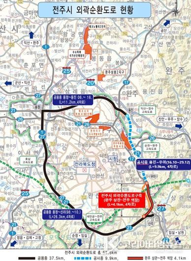 현재까지 완주 신리~전주 용정~용진을 잇는 37.5km 구간은 사업비 7,149억원을 들여 개통 운영 중이며, 전주 용진~우아(색장동) 9.9km 구간은 사업비 3964억 원을 들여 2029년 준공을 목표로 공사가 진행 중이다. 하지만 완주 상관~전주 색장 구간은 아직 착수 단계에 이르지 못해 외곽순환망의 기능이 반쪽에 그치고 있다는 지적이 이어져 왔다.