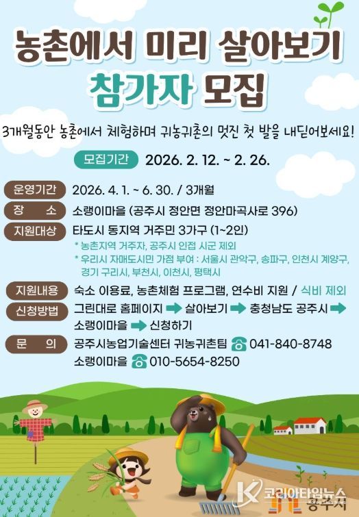 코리아타임뉴스 충남취재본부 | 공주시는 예비 귀농·귀촌인이 농촌 생활을 직접 체험하며 정착을 준비할 수 있도록 돕는 ‘농촌에서 미리 살아보기’ 프로그램 상반기 참가자를 오는 2월 26일까지 모집한다고 밝혔다.