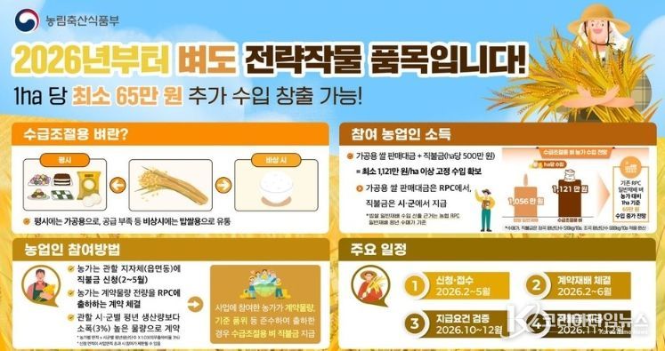 코리아타임뉴스 김태훈 기자 | 정읍시가 쌀 공급 과잉 해소와 농가 소득 안정이라는 두 마리 토끼를 잡기 위해 올해부터 ‘수급조절용 벼’를 전략작물직불제 대상 품목에 포함했다고 19일 밝혔다.
