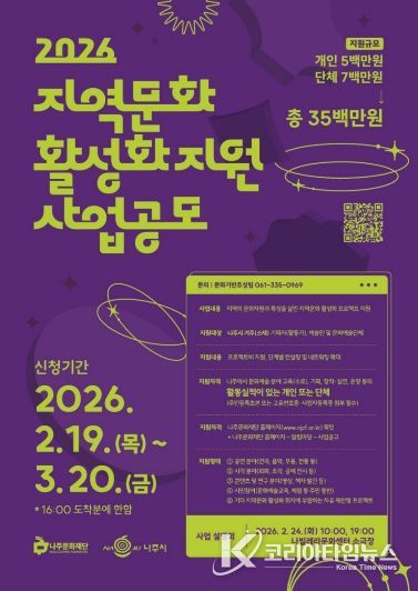 나주문화재단은 ‘2026 지역문화 활성화 지원사업’ 공모를 오는 3월 20일 오후 4시까지 진행한다고 19일 밝혔다.