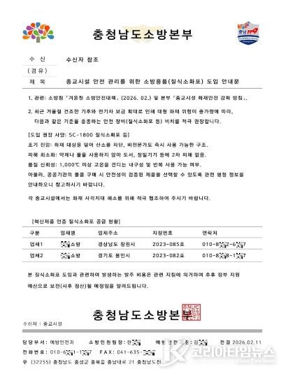코리아타임뉴스 김태훈 기자 | 충남소방본부 공문서를 위조해 소방공무원을 사칭하고 종교시설 등에 소방용품 구매를 강요한 사례가 발생해 각별한 주의가 요구된다.
