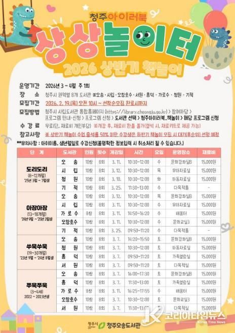 코리아타임뉴스 충북취재본부 | 청주오송도서관은 오는 2월 28일까지 청주시 영유아와 양육자를 대상으로 ‘청주 아이러북(LoveBook)’ 상반기 책놀이 프로그램 수강생을 모집한다고 20일 밝혔다.