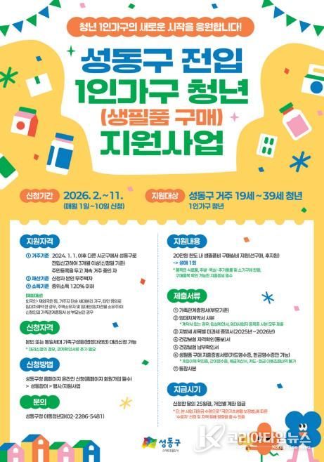 코리아타임뉴스 오영주 기자 | 서울 성동구는 올해부터 ‘전입 1인가구 청년 생필품구매 지원사업’의 지원 요건을 완화해, 성동구로 이사 오면서 독립을 시작하는 청년들이 안정적으로 정착할 수 있도록 보다 폭넓게 지원한다고 밝혔다.
