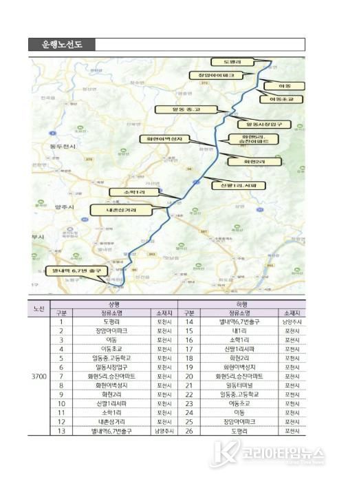 코리아타임뉴스 윤광희 기자 | 포천시는 오는 3월 4일부터 경기도 광역 공공버스 신규 노선인 3700번(도평리–별내역)을 정식 운행한다고 밝혔다.