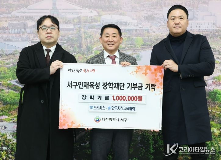 코리아타임뉴스 대전취재본부 | 대전 서구 인재육성장학재단은 20일 서구청 갑천누리실에서 민관 평생학습지원 업무협약 기관인 ㈜트리시스와 ㈜한국지식교육협회로부터 장학기금 100만 원을 전달받았다.