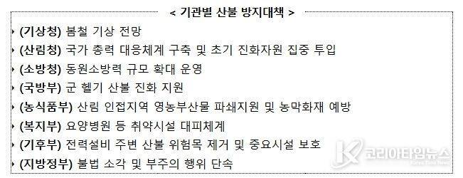 코리아타임뉴스 김태훈 기자 | 행정안전부 2월 20일 김광용 재난안전관리본부장 주재로 ‘봄철 산불방지 관계기관 대책회의’를 개최*했다.