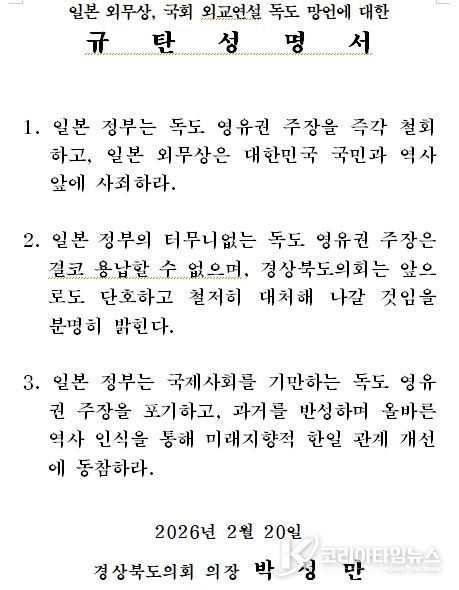 코리아타임뉴스 노승선 기자 | 경상북도의회는 20일, 모테기 도시미쓰 일본 외무상이 일본 국회에서 독도 영유권을 주장하는 망언을 한 데 대해 강력히 항의하며, 독도는 대한민국의 고유 영토임을 재차 천명하는 성명서를 발표했다.