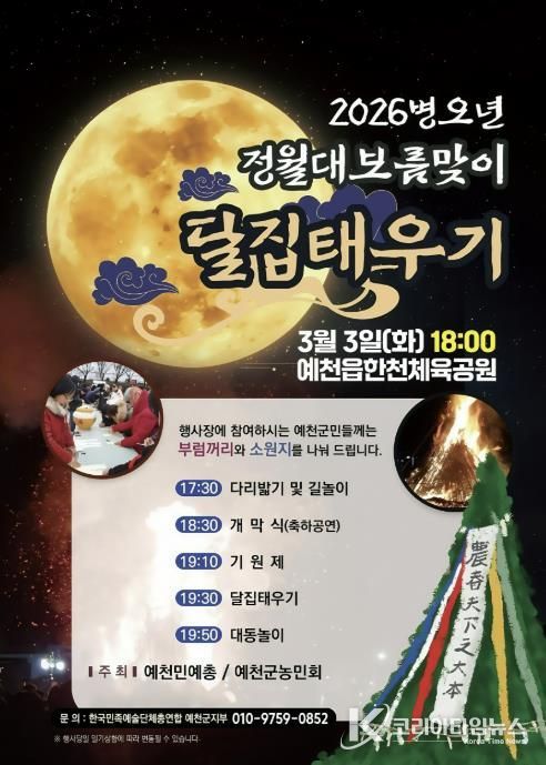 코리아타임뉴스 경북취재본부 | 예천군은 오는 3월 3일 오후 5시 30분에 예천읍 한천체육공원에서 ‘2026년 병오년 정월대보름 달집태우기 행사’를 개최한다고 밝혔다.