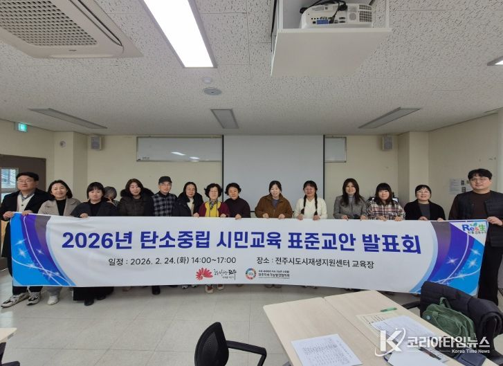 코리아타임뉴스 김태훈 기자 | 전주시는 24일 전주시도시재생지원센터에서 탄소중립 시민강사 30여 명이 참석한 가운데 시민들의 탄소중립 교육 선택의 폭을 넓히고, 생애주기별 교육의 질을 높이기 위한 ‘2026년 생애주기별 탄소중립 교육사업 표준교안 발표회’를 개최했다.