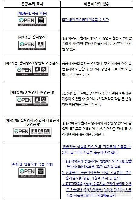 아울러, 기존 공공누리 유형(제1~4유형)의 이용조건은 유지하면서 인공지능(AI) 학습 목적으로는 공공저작물을 자유롭게 활용할 수 있는 ‘인공지능(AI)유형’도 새롭게 마련했다. 기존에 상업적 이용이나 변경 이용이 허용되지 않는 공공저작물이라도 ‘인공지능(AI)유형’을 기존 공공누리 유형과 함께 표시할 경우, 인공지능(AI) 학습에는 자유롭게 활용할 수 있다는 점에서 인공지능(AI) 분야의 활성화를 위해 개방할 수 있는 공공저작물의 범위가 크게 확대될 전망이다.
