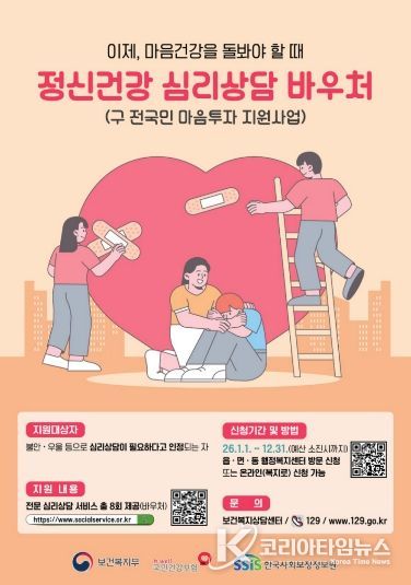 배강숙 건강위생과장은 “심리적으로 도움이 필요한 시민의 마음건강을 돌보고 정신질환을 예방하기 위해 정신건강 심리상담 바우처사업을 운영하고 있다”며 “이 사업을 통해 어려움을 겪는 시민들이 도움을 받을 수 있길 바란다”고 말했다.