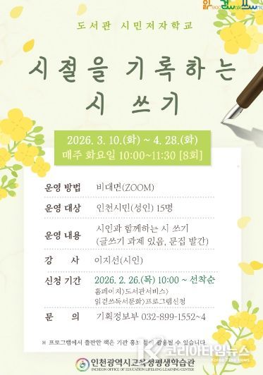 코리아타임뉴스 사회팀 | 인천광역시교육청평생학습관은 시민의 문학적 감수성을 함양하고 인문학적 소양을 넓히기 위하여, 오는 26일부터 ‘시절을 기록하는 시 쓰기’ 성인 프로그램 수강생을 모집한다.