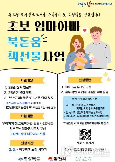 코리아타임뉴스 경북취재본부 | 김천시립도서관(관장 이신기)은 예비 부모와 영아 가정을 응원하고, 생애 초기부터 책과 함께하는 양육 환경을 조성하기 위해 '초보 엄마아빠 북돋움 책선물 사업'을 추진한다.