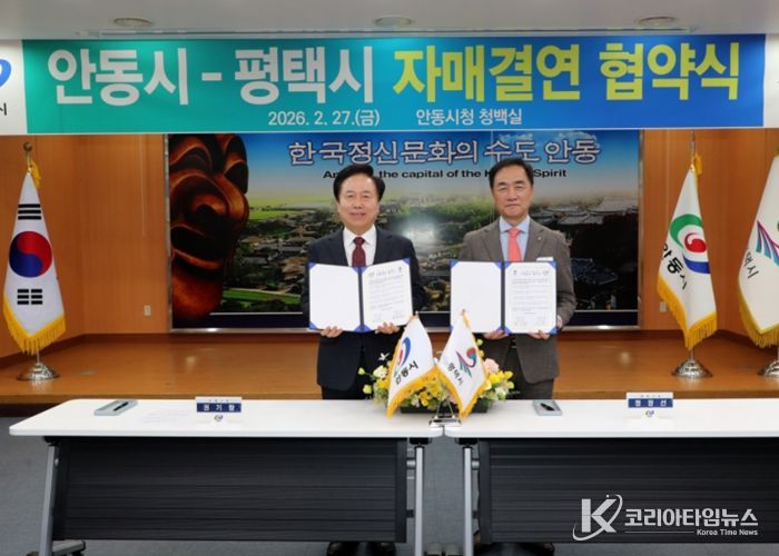 코리아타임뉴스 노승선 기자 | 안동시는 2월 27일 안동시청에서 평택시와 자매결연 협약을 체결하고 경제․문화․관광‧농업 등 전 분야에 걸친 상생발전의 닻을 올렸다.