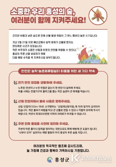 코리아타임뉴스 충남취재본부 | 홍성군은 산림 인접 지역 농막과 농촌체류형쉼터 이용 증가에 따라 화재 위험을 사전에 차단하기 위해 관련 소유자를 대상으로 산불예방 안내문을 배포하고, 군민 참여형 안전문화 확산에 나섰다. 이번 조치는 생활 속 실천 중심의 예방 활동을 통해 산불 위험을 낮추기 위한 선제적 대응이다.