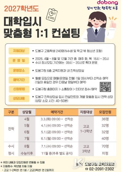 코리아타임뉴스 사회팀 | 서울 도봉구가 지역 내 고등학생을 대상으로 '대학입시 맞춤형 1대1 컨설팅'을 운영한다.