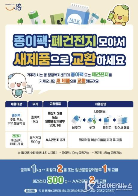 코리아타임뉴스 경기취재본부 | 시흥시는 생활 속 자원순환 문화 확산을 위해 종이팩 교환 사업을 지속 추진하는 한편, 올해부터 폐건전지 교환 사업을 확대 시행한다.