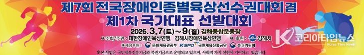 코리아타임뉴스 오영주 기자 | 대한장애인육상연맹(회장 박흥식)과 김해시장애인육상연맹(회장 조석제)이 주최·주관하고, 김해시가 후원하는 ‘제7회 전국장애인종별육상선수권대회 겸 제1차 국가대표 선발대회’가 오는 3월 7일부터 9일까지 김해종합운동장에서 개최된다.