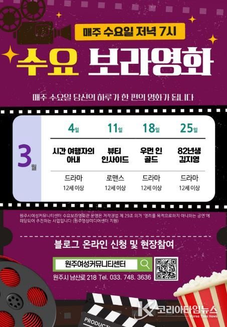 코리아타임뉴스 이아름 기자 | 원주시여성커뮤니티센터는 여성의 역량 강화와 지역 내 소통 활성화를 위해 매달 다양한 프로그램을 운영하고 있다. 특히 매주 수요일 저녁 7시 진행되는 ‘수요보라영화관’은 시민들에게 큰 호응을 얻고 있다.