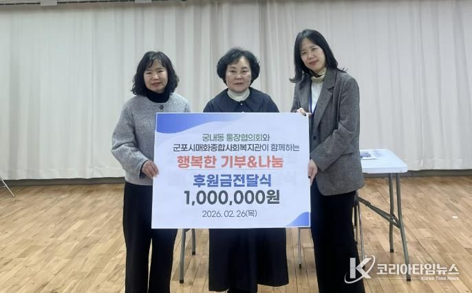 코리아타임뉴스 사회팀 | 군포시 궁내동통장협의회는 지난 2월 26일 매화종합사회복지관에 후원금 100만원을 전달했다.
