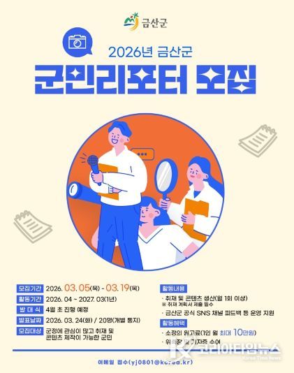 코리아타임뉴스 충남취재본부 | 금산군은 군민의 시선으로 지역의 다양한 이야기를 전할 2026년 군민리포터를 공개 모집한다.