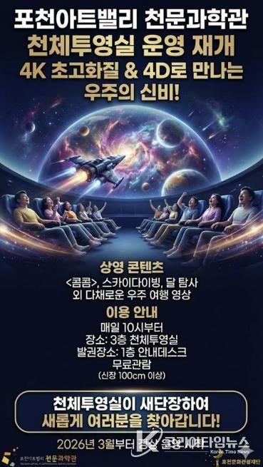 코리아타임뉴스 윤광희 기자 | 포천문화관광재단이 운영하는 포천아트밸리 천문과학관이 약 1년간의 준비와 개선 사업을 마치고, 3월 4일부터 새롭게 단장한 천체투영실 운영을 재개한다.
