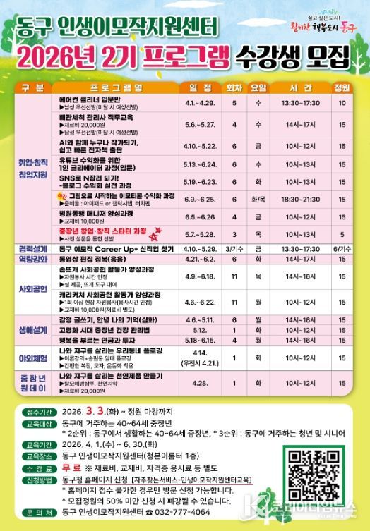 코리아타임뉴스 이아름 기자 | 인천 동구는 중장년층의 성공적인 노후 준비와 사회활동 재참여를 지원하기 위해‘2026년 2기 동구 인생이모작지원센터 프로그램’ 수강생을 모집한다고 밝혔다.