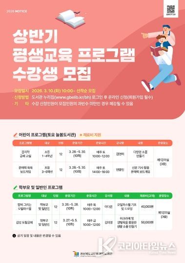 코리아타임뉴스 사회팀 | 경상북도교육청 봉화도서관(관장 이영숙)은 지역 주민의 평생학습 기회를 넓히기 위해 상반기 평생교육 및 토요 늘봄도서관 프로그램 수강생을 모집한다.