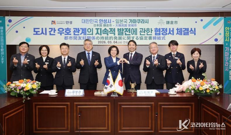 코리아타임뉴스 경기취재본부 | 안성시는 2026년 3월 4일 오전 11시 안성시청 본관 2층 상황실에서 일본 가나가와현 가마쿠라시(시장 마쓰오 다카시)와 '도시 간 우호 관계의 지속적 발전에 대한 협정'을 체결하고 양 도시 간 문화·예술 및 청소년 분야 교류를 본격 추진하기로 했다.
