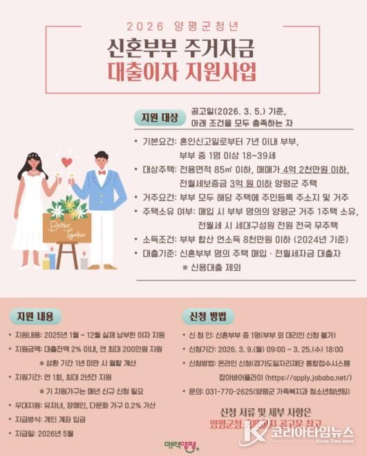 코리아타임뉴스 기동취재팀 | 양평군은 주택 매입 또는 임차(전월세) 자금 대출을 받은 양평군 거주 청년 신혼부부를 대상으로 연간 최대 200만 원의 대출이자를 지원하는 ‘2026년 양평군 청년 신혼부부 주거자금 대출이자 지원 사업’을 시행한다고 5일 밝혔다.