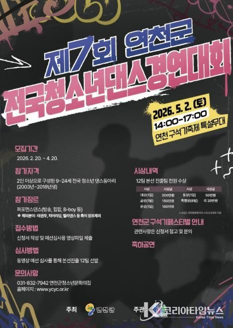 코리아타임뉴스 윤광희 기자 | (재)연천군청소년육성재단(청소년문화의집)은 전국 청소년들이 꿈과 열정을 마음껏 펼칠 수 있는 무대를 마련하고, 창의적인 문화예술 활동을 확산하기 위해 제7회 연천군 전국청소년댄스경연대회를 개최한다고 밝혔다.