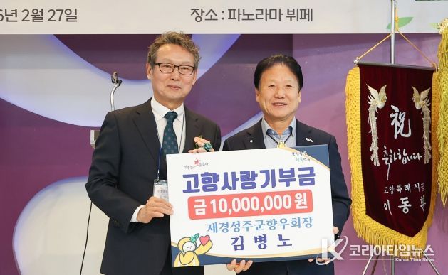 코리아타임뉴스 경북취재본부 | 재경성주군향우회 김병노 회장이 지난달 27일 서울 종로구에서 열린‘2026년 재경성주군향우회 신년 교례회’에서 고향 발전을 위한 고향사랑기부금을 1,000만 원 기탁했다.