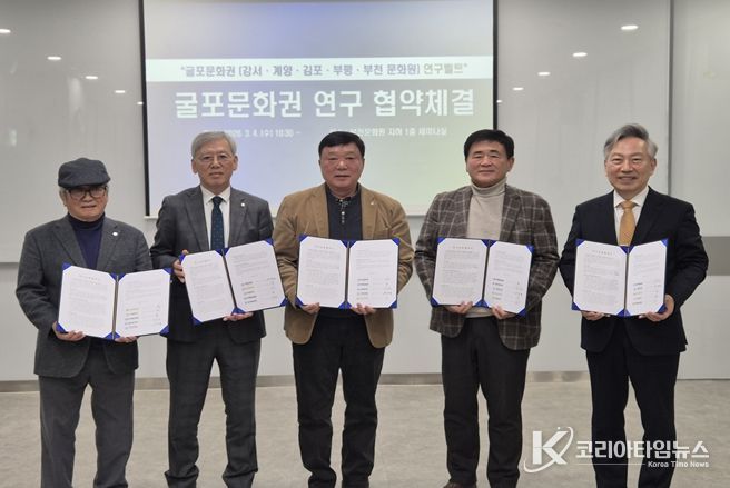 코리아타임뉴스 경기취재본부 | 부천문화원과 강서문화원, 계양문화원, 김포문화원, 부평문화원은 3월 4일 부천문화원에서 ‘굴포문화권’을 토대로 하는 연구교류 협약식을 체결했다. 이로써 ‘굴포’를 같은 문화권으로 하는 부천문화원·강서문화원·계양문화원·김포문화원·부평문화원은 학술대회와 콘텐츠 발굴 사업 등 다양한 지역학 자원을 발굴하고 활성화하기 위해 최초로 지역학 연구 모델을 구축하게 됐다. 특히, 이번 협약은 경기도(부천, 김포), 서울특별시(강서), 인천광역시(계양, 부평)를 잇는 ‘지역학’ 중심의 연구 교류를 마련한다는 점에서 주목된다.