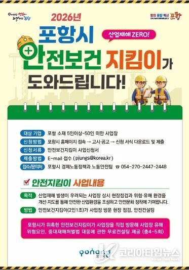 코리아타임뉴스 경북취재본부 | 포항시는 지역 소규모 사업장의 산업재해를 예방하고 자율적인 안전관리 체계를 구축하기 위해 ‘2026년 안전보건지킴이 지원사업’ 참여 사업장을 모집한다.