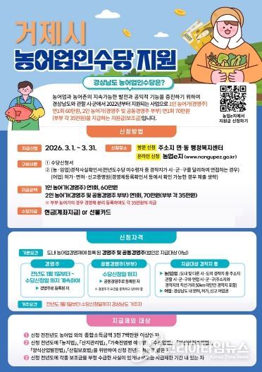 코리아타임뉴스 경남취재본부 | 거제시는 농어업·농어촌의 공익적 기능을 유지·증진하고 농어업인의 소득 안정을 지원하기 위해 ‘2026년 농어업인수당’ 신청을 3월 1일부터 3월 31일까지 접수하고 있다.