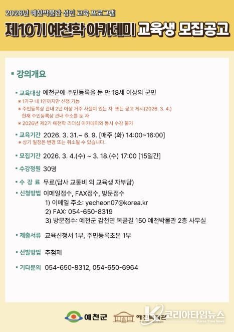 코리아타임뉴스 경북취재본부 | 예천군은 2026년 상반기 ‘예천학 및 예천학 리더십 아카데미’ 교육생을 18일까지 모집한다.