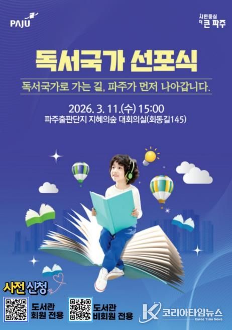 코리아타임뉴스 기동취재팀 | 파주시는 오는 11일 15시, 파주출판도시 지혜의숲 대회의실에서 ‘파주시 독서국가 선포식’을 개최하고 책 읽는 도시를 넘어 ‘독서국가’로 나아가기 위한 힘찬 출발을 알린다.