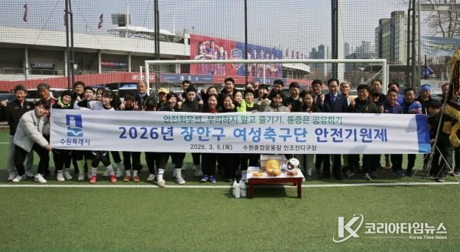 코리아타임뉴스 이아름 기자 | 수원시 장안구 여성축구단은 지난 5일, 수원종합운동장 인조잔디구장에서 선수단과 관계자 등 30여 명이 참석한 가운데 2026년 안전기원제를 진행했다.