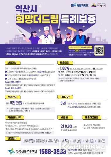 익산시 관계자는 "어려운 경제 상황에서 지역경제를 지탱하고 있는 소상공인을 위한 실질적인 금융 지원이 절실한 상황"이라며 "특례보증과 이자 지원으로 자금 부담을 완화하고, 소상공인의 경영 안정과 재도약을 뒷받침하도록 적극 지원하겠다"고 말했다.