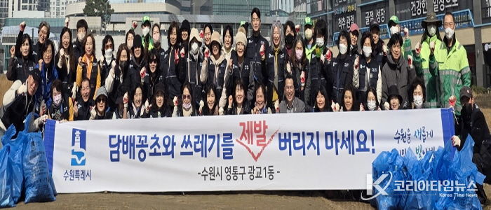코리아타임뉴스 윤광희 기자 | 영통구 광교1동 행정복지센터는 지난 3월 5일 통장협의회와 환경관리원 등 60여 명이 참여한 가운데 무단투기 지역을 중심으로 봄맞이 환경정비 활동을 실시했다.