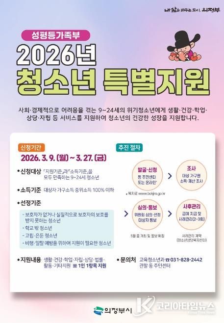 코리아타임뉴스 기동취재팀 | 의정부시는 3월 9일부터 27일까지 ‘2026년 청소년 특별지원’ 사업 대상자를 모집한다.