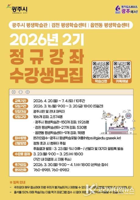 코리아타임뉴스 사회팀 | 광주시는 오는 16일부터 20일까지 2026년 제2기 평생학습 프로그램 수강생을 모집한다고 6일 밝혔다.