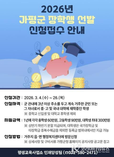 코리아타임뉴스 기동취재팀 | 가평군이 지역 학생들의 균등한 교육 기회를 보장하고 우수 인재를 육성하기 위해 2026년도 장학생 선발에 나선다.