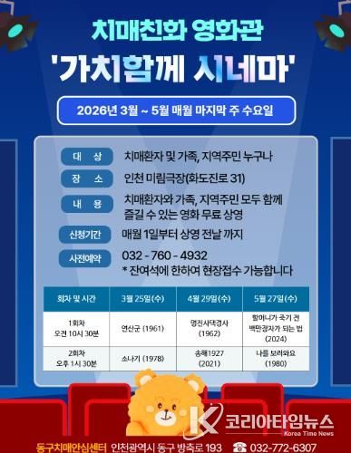 코리아타임뉴스 이아름 기자 | 인천 동구는 치매환자와 가족, 지역주민이 문화를 향유 할 수 있는 치매친화 영화관 ‘가치함께 시네마’를 오는 3월~5월까지 매월 마지막 주 수요일 운영한다고 밝혔다.