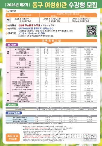 코리아타임뉴스 이아름 기자 | 인천 동구는 오는 3월 9일~4월 3일까지‘2026년 제2기 동구 여성회관’ 수강생을 모집한다고 밝혔다.